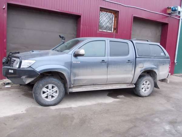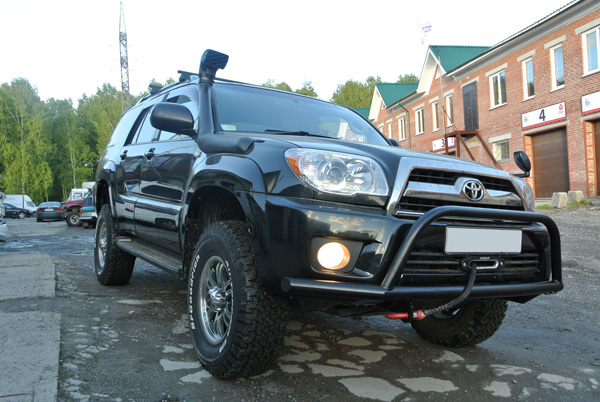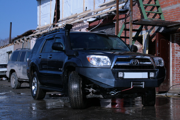 Силовой бампер собственного изготовления, лебедка ComeUp DV-9, лифт 2 дюйма, шноркель LLDPE (доработанный от HiLux), светодиодные фары, защита рулевых тяг собственного пр-ва.